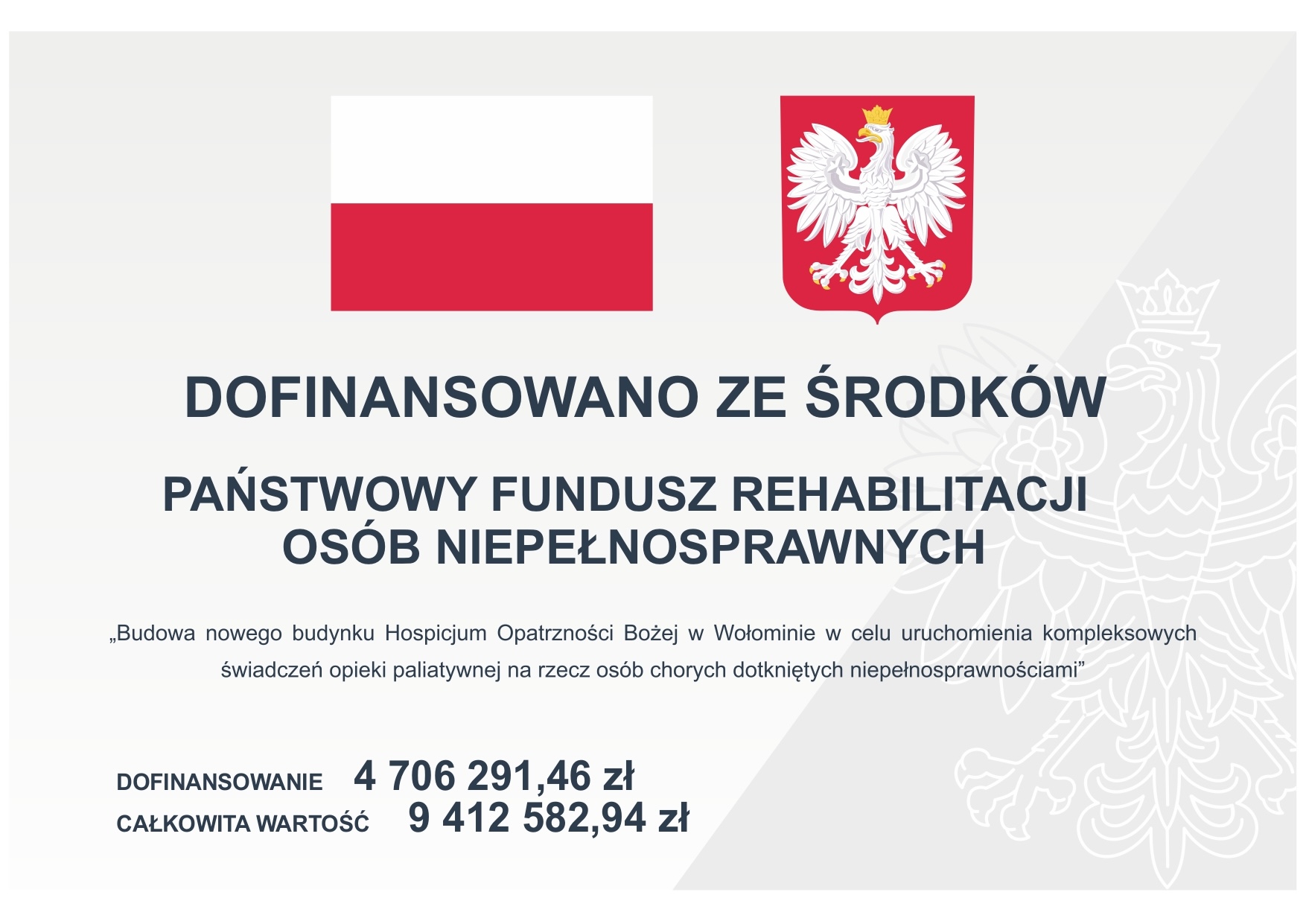 Z radością informujemy, że Hospicjum Opatrzności Bożej otrzymało dofinansowanie w kwocie 4 706 291,46 zł ze środków Państwowego Funduszu Rehabilitacji Osób Niepełnosprawnych (PFRON).